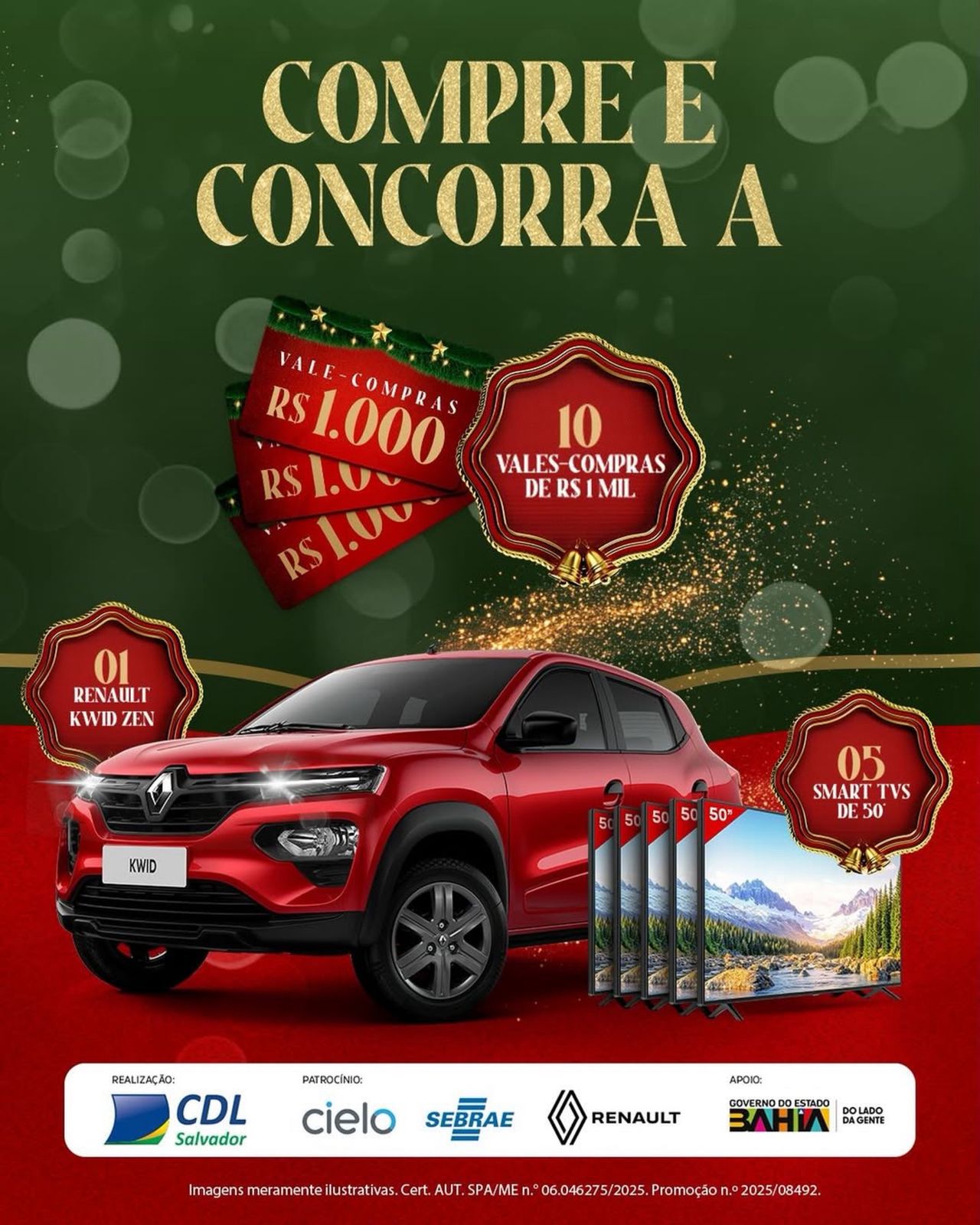 A CDL Salvador lança a campanha promocional “Salvador, Natal de Luz e Prêmios 2025”, para movimentar o comércio. Participam lojas de rua e shoppings de diferentes tamanhos na capital e Região Metropolitana. A ação distribuirá, via sorteio, prêmios como um automóvel Renault Kwid Zen 1.0, cinco televisores Smart de 50 polegadas e dez vales-compra de R$ 1.000 cada um.