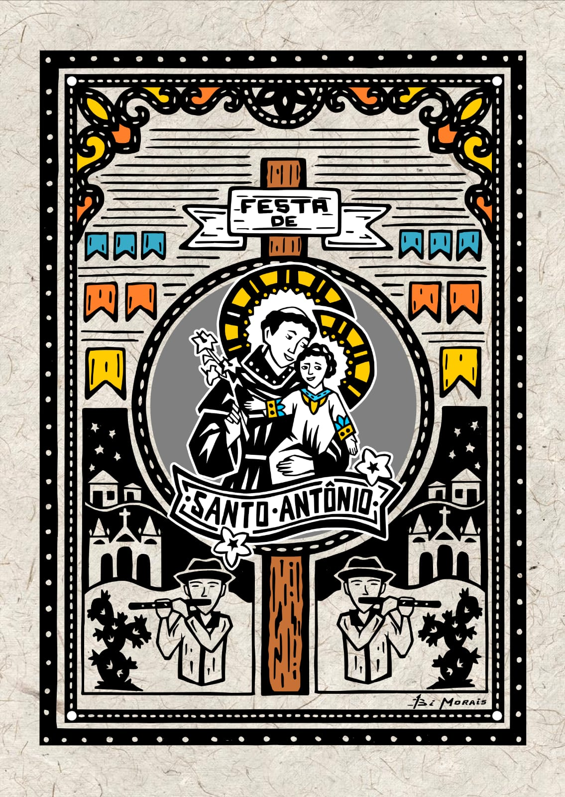 Nela, o artista baiano convida o público a olhar para as gravuras que são ilustradas poeticamente pelos cordéis, retratando de forma visual e literária o diálogo entre fé e cultura nordestina sertaneja, notadamente existente nas canções de Luiz Gonzaga. As gravuras foram inspiradas no traço das xilogravuras e nas letras de canções de Gonzagão, onde a religiosidade do catolicismo popular é um tema comum. Através do cordel, são narradas as histórias e causos presentes nas gravuras, dando à mostra um caráter multiartístico. Para isso, o cordelista e músico Rodrigo Chianca foi convidado para compor esse projeto, que parte de uma pesquisa de Bi Morais, que é também músico forrozeiro, sobre a cultura sertaneja, as canções do Rei do Baião e a religiosidade popular.