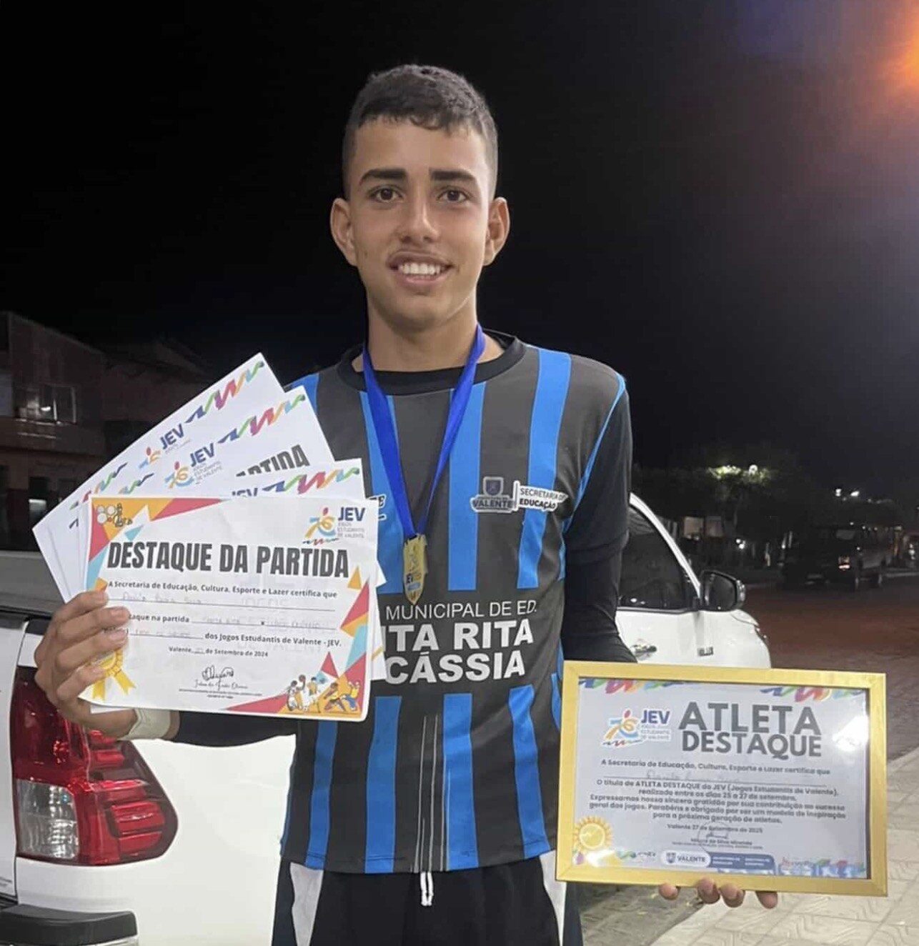 E teve mais. O adolescente também ganhou o troféu de atleta destaque do JEV (Jogos Estudantis de Valente), na modalidade futsal, em uma premiação municipal dos jogos escolares. Para ele, não foi só um prêmio individual. Foi um sentimento de conquista que alcançou a escola inteira. “Recebi alguns certificados e isso foi um marco muito importante na minha vida e para todos da minha escola também.”