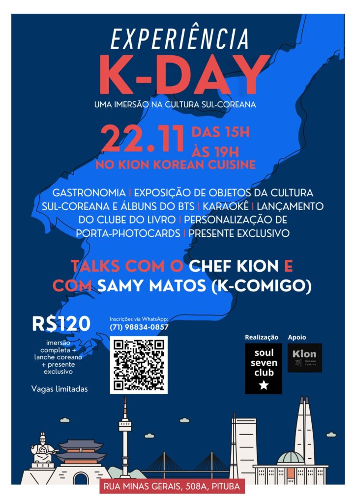A imersão seguirá com talks com o chef sul-coreano Kion e com Samy Matos, uma das criadoras do perfil “K-comigo”, voltado para o universo do país asiático. Além disso, há o lançamento do clube do livro focado em obras de autores sul-coreanos, degustação da culinária típica, karaokê, personalização de porta-photocards e apresentação de uma linha de produtos inspirados nas músicas do BTS da Soul Seven Club, marca que assina o evento.