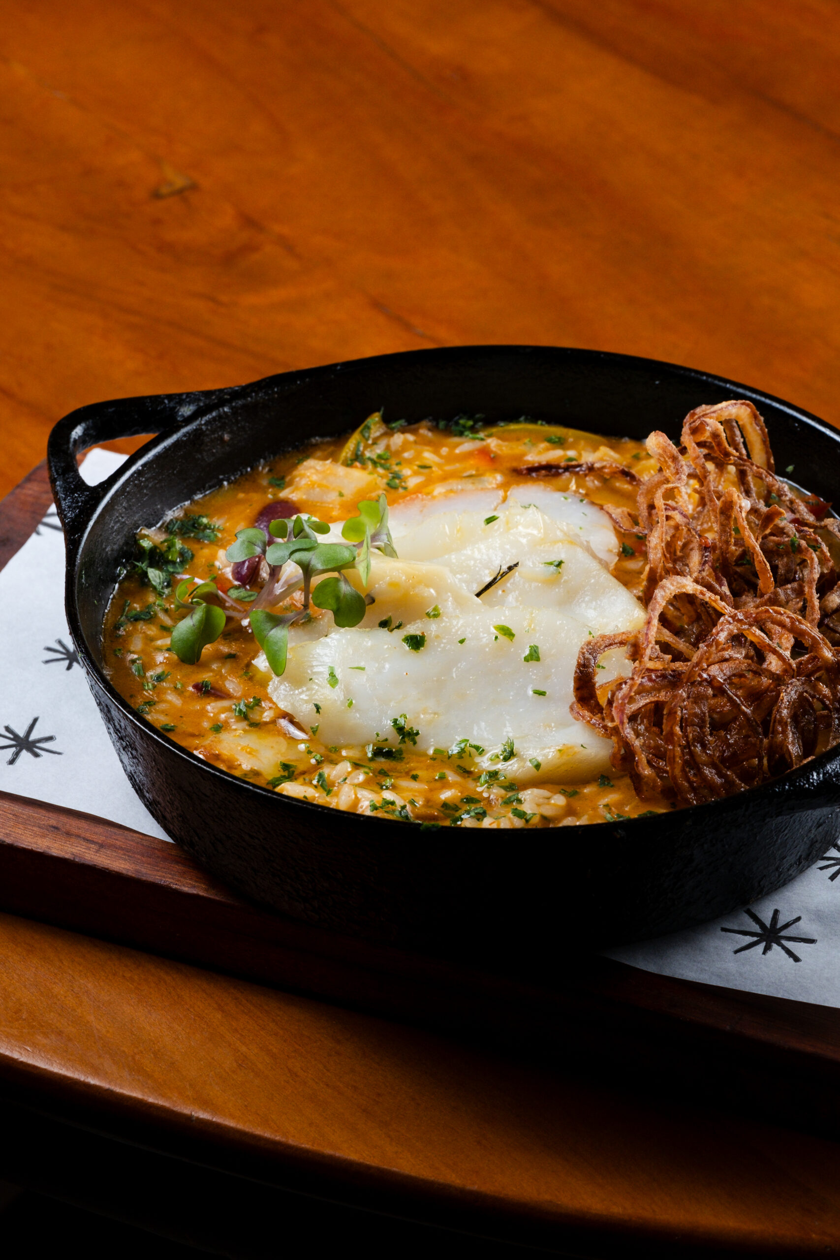 Bacalhau glaceado no missô, grelhado no carvão com arroz frito de nirá, eringy e bacon, emulsão de pimentões tostados e palha de batata doce.