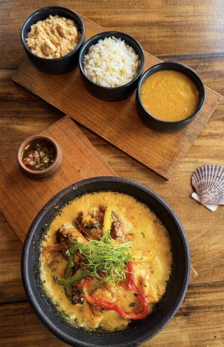 No Vini Figueira Gastronomia, a proposta passa pela culinária baiana, com pratos como moqueca de peixe, bobó de camarão e arroz de frutos do mar, disponíveis tanto no salão quanto para entrega.