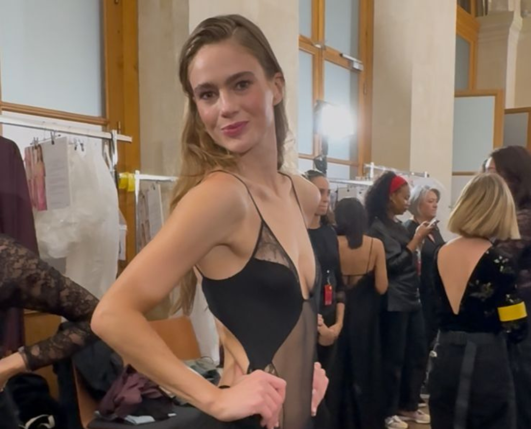 A modelo brasileira Maria Klaumann desfilou para a marca francesa Etam durante a 18ª edição do J’Etam, evento apresentado no Palais Brongniart, em Paris, como parte da programação oficial da Paris Fashion Week. A marca mostrou sua nova coleção de moda íntima feminina, reforçando temas como liberdade, inclusão e empoderamento. Maria usou um conjunto de lingerie preta com transparência e detalhes em renda, combinado a uma saia de alfaiataria estruturada, alinhado ao conceito da campanha J’Etam, que celebra todas as formas de amor.