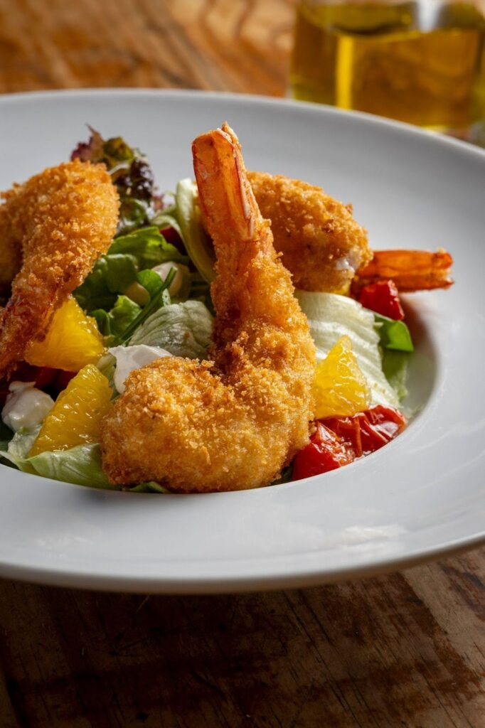Para o almoço, as opções de entrada incluem Mix de folhas ao molho cítrico com queijo de cabra, tomates assados, laranja Bahia e camarões empanados ou Focaccia tradicional acompanhada de pesto e pomodoro picante.