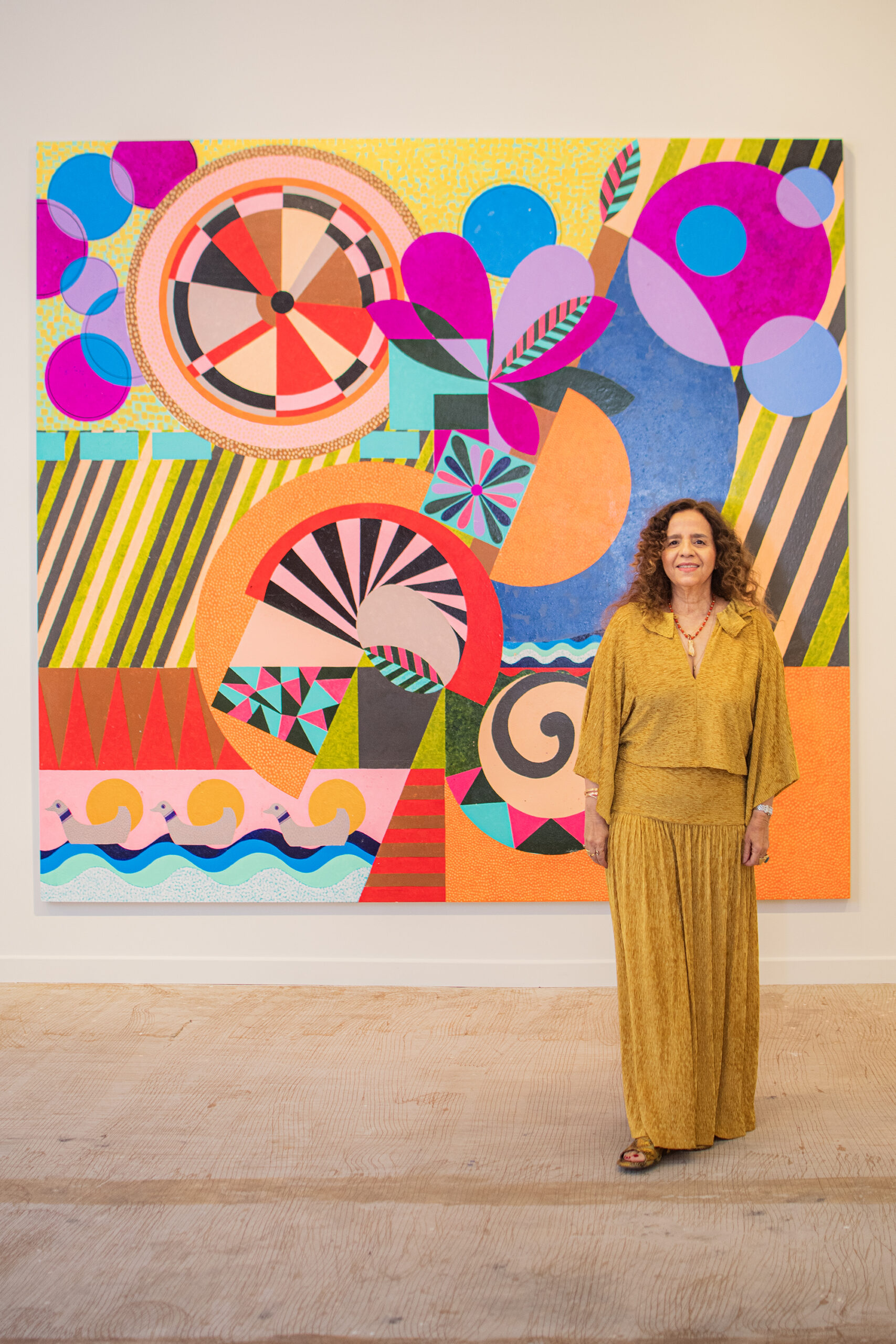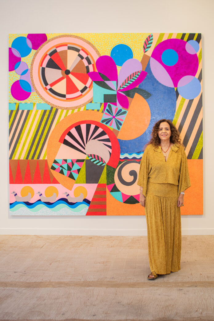 As cores da Bahia fascinam Beatriz Milhazes, um dos nomes mais expressivos da arte contemporânea brasileira. Assim, com essa inspiração, a artista carioca trouxe a Salvador uma obra inédita. “O Giro das Águas I” (2025) foi criado especialmente para a mostra do MAB – Museu de Arte da Bahia. O grande painel ocupa uma posição de destaque em uma das paredes do salão da mostra, que tem a curadoria assinada por Tiago Mesquita.