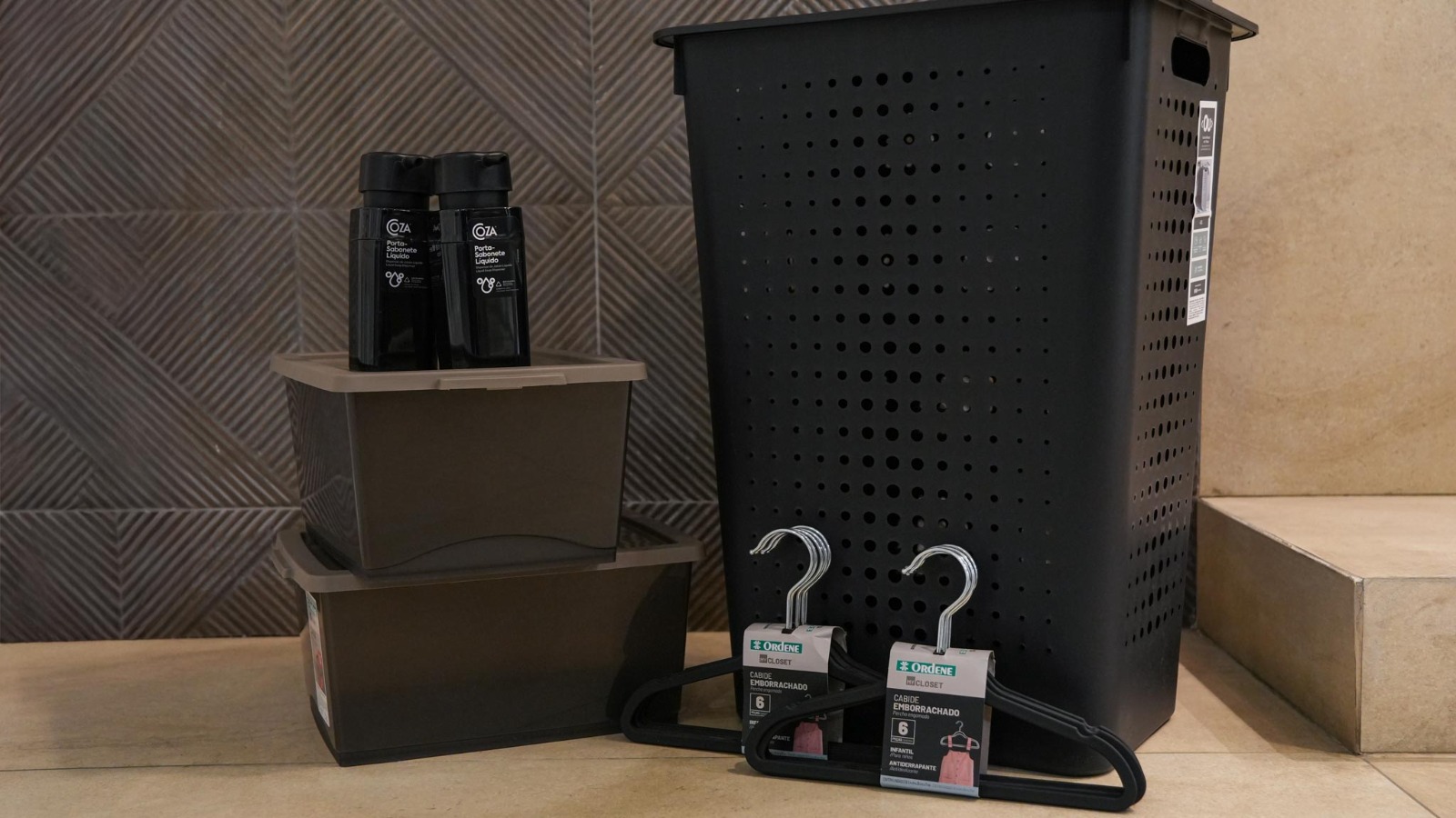 O mix inclui ainda soluções para a organização de closets, quartos e áreas de serviço, como prateleiras, caixas empilháveis, organizadores de gaveta, evita mofo e lixeiras, otimizando espaços e tornando a rotina mais prática.