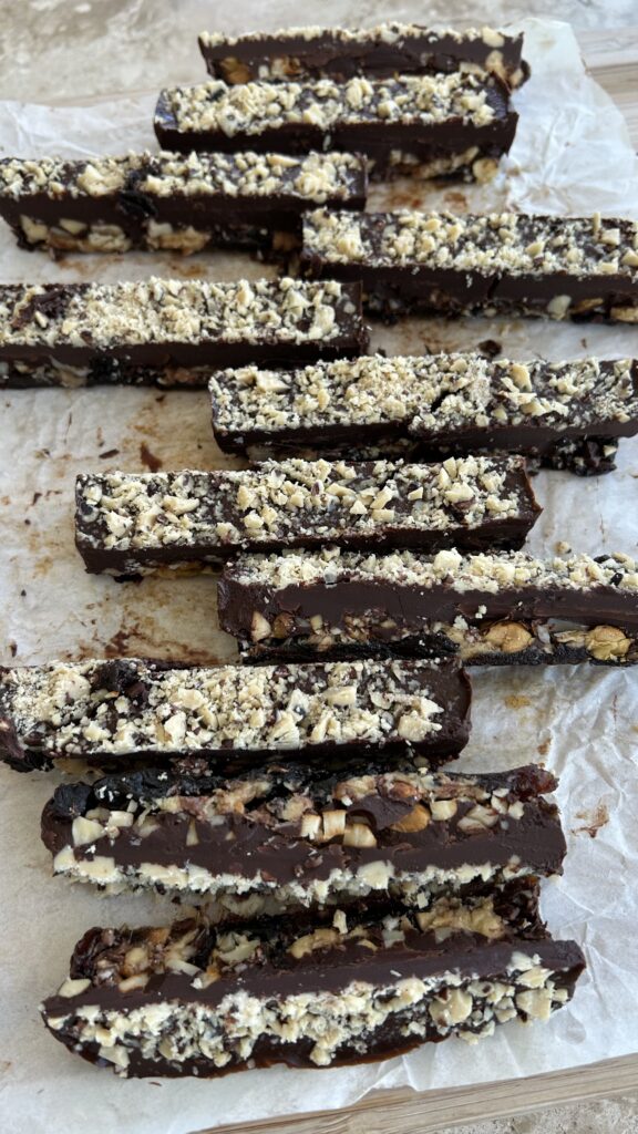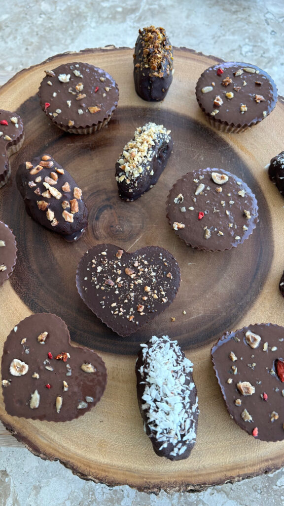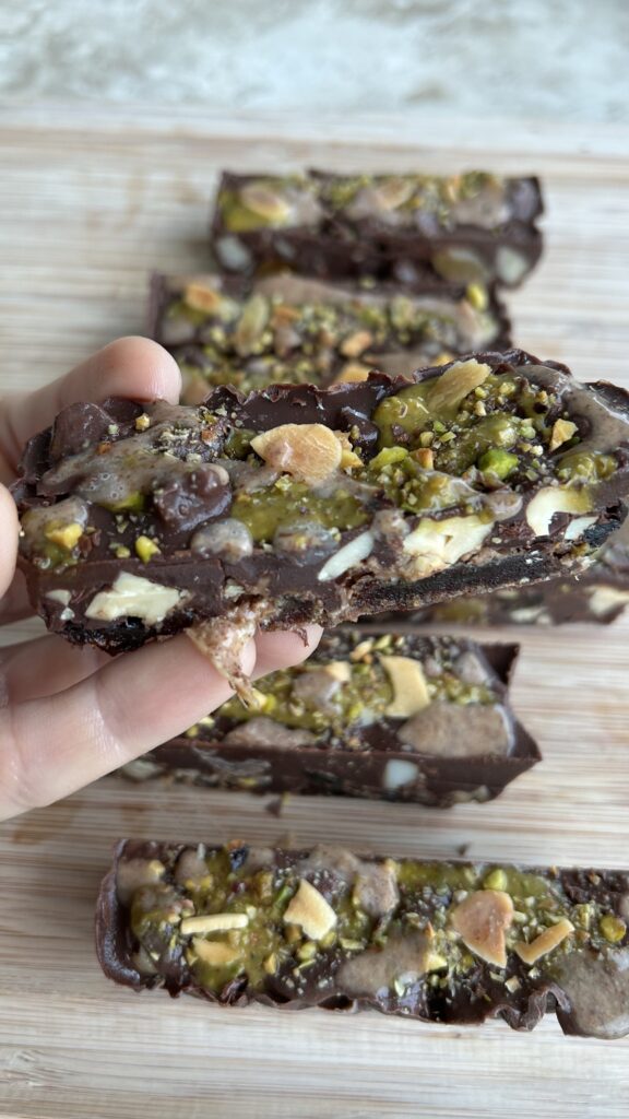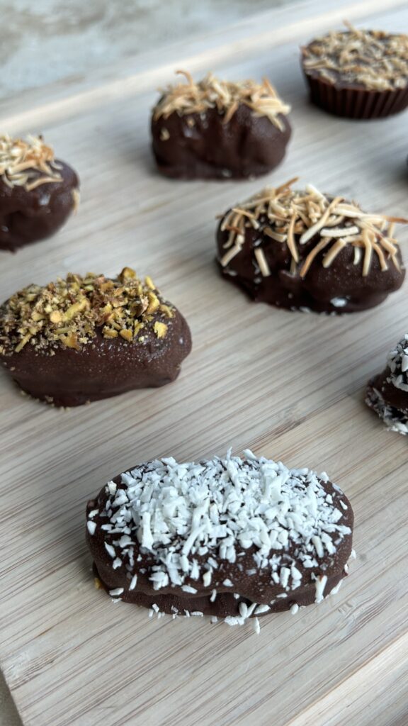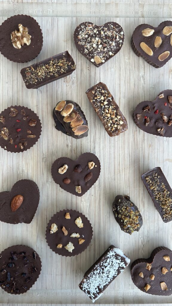 Mell trabalha com chocolate da Amma como base, aliado a frutas secas, castanhas e pastas de oleaginosas, sempre com o mínimo de ingredientes possível: “nada de açúcar, nada de aditivo, nada de conservante”, faz questão de frisar. Em alguns bombons, entram tâmara ou damasco; em outros, pasta de castanha, de pistache, de amendoim ou de coco, muitas vezes finalizados com coco por cima. A proposta é clara: entregar um doce que mate a vontade de chocolate, mas sem inflamar o organismo nem recorrer a ultra processados.