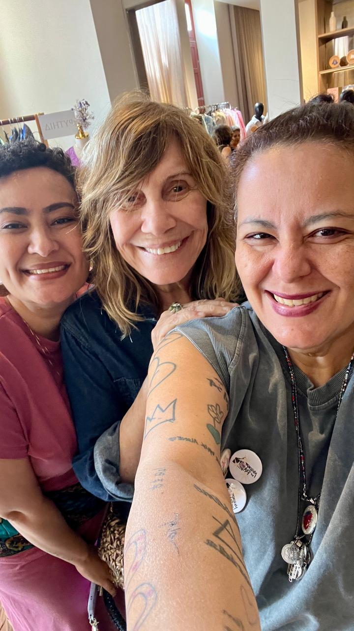 As produtoras do Mercado do Tira, Lívia Falcão e Gabi Cruz, recepcionaram Renata Sorrah no evento na tarde deste sábado (11).