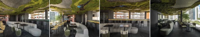 O musgo natural estabilizado forma um canopy orgânico que percorre o restaurante e redefine o teto como superfície ativa. Resultado de processos tecnológicos que preservam cor, textura e volume sem necessidade de irrigação ou luz solar, o material associa inovação e desempenho ambiental. A camada suspensa dilui limites e introduz uma leitura espacial alinhada à biofilia presente em projetos contemporâneos de Tóquio, Cingapura, Londres e Nova York.  Além de seu impacto visual, o elemento aprimora a acústica, regula a absorção sonora, reduz reverberações e contribui para o conforto. Sua utilização reforça a imersão proposta pelo projeto.